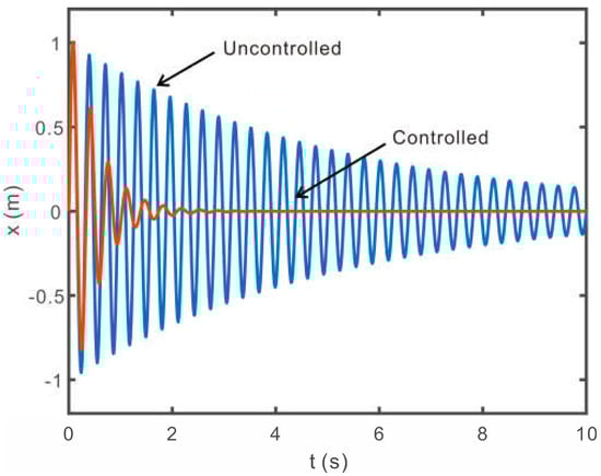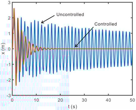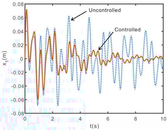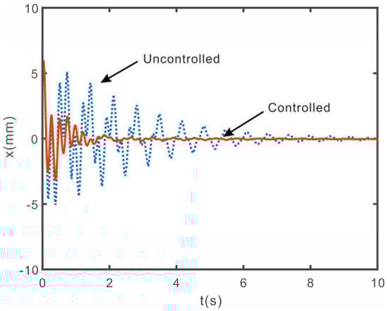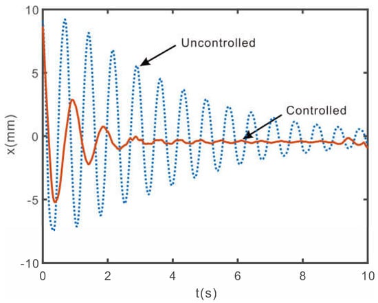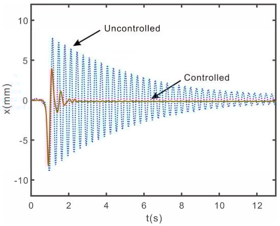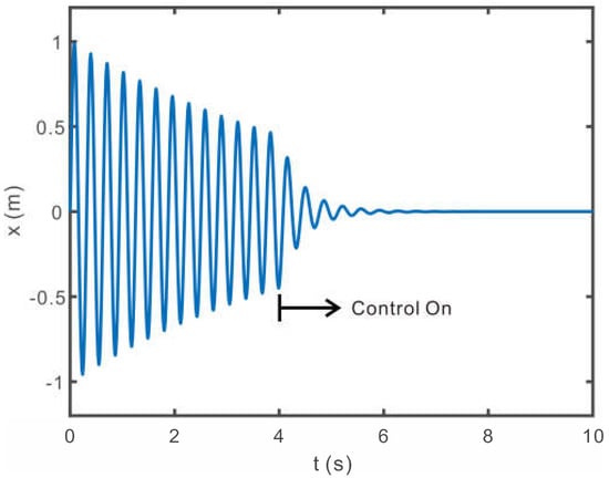 Figure 4 shows the Bode diagram of the closed-loop transfer function for various gains, where was employed. It can be seen from Figure 4 that is good enough, and a large gain rather degrades the performance of the closed loop system. Figure 5 shows the uncontrolled and controlled impulse responses when , , , . Using logarithmic decrement, the damping factor of the controlled system was found to be 0.107. Figure 6 shows the displacement response the controller is turned on at 4 s. As shown in Figure 5 and Figure 6, it can be seen that the PIPO controller proposed in this study can reduce the response very effectively.