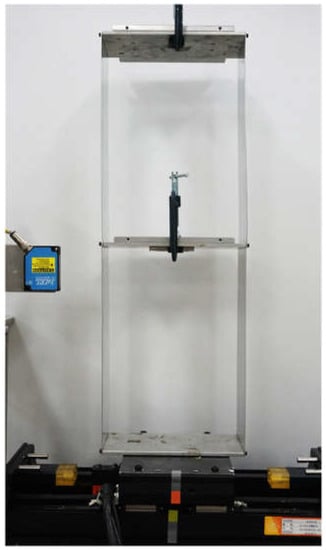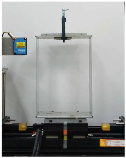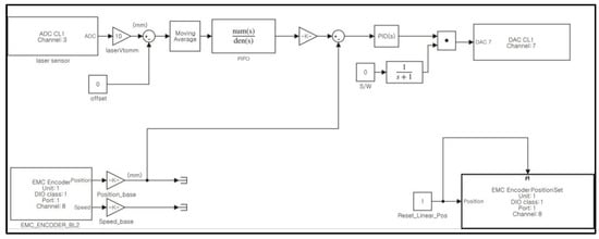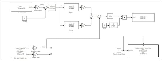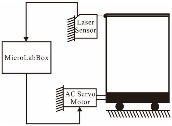 Figure 7 shows the simple model that was set up to prove the validity of the proposed PIPO controller given by Equation (5), whereas Figure 8 shows the wire connection diagram for the experiment. The displacement of the floor was measured using the laser displacement sensor, (M3L/20), from MEL, and the base movement was made by the linear servo motor, (LM-H3P2A-07P-BSS0), Mitsubishi Electric Co., Tokyo, Japan, whereas the PIPO control algorithm was implemented using dSPACE MicroLabBox.