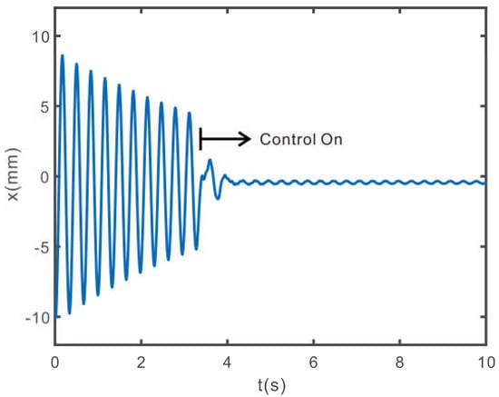 Through the free vibration experiment, the fundamental frequency of the model was found to be 3.2 Hz. The PIPO controller is implemented as a Simulink block diagram, as shown in Figure 9. The voltage signal output from the laser sensor is converted into actual displacement by multiplying the gain corresponding to the sensor characteristic. A moving average filter is used to remove sensor noise, and the displacement is used as an input to the PIPO controller. The outputted control displacement from PIPO controller is input to the servo motor. The proportional-integral-derivative (PID) controller is used for accurate displacement-tracking control of a linear servo motor [28]. For real-time displacement tracking, the servo motor driver’s mode was set to speed mode. For details, refer to reference [25]. The gain values of the PIPO controller and the PID were experimentally set. When a control signal is suddenly input to the servo motor, the motor is shocked, so a switch was created in the program so that the control signal was input smoothly. Figure 10 shows the free vibration response of the uncontrolled system and the controlled system, whereas Figure 10 shows how quickly vibrations are suppressed when the PIPO controller is turned on. Using logarithmic decrement, the damping factor of the uncontrolled system is calculated as 0.033, and the damping factor of the controlled system is 0.168. Figure 10 and Figure 11, the response curves obtained through experimentation, are very similar to the theoretical response curve shown in Figure 5 and Figure 6. Therefore, it can be confirmed that the performance of the PIPO controller predicted by the theory in the previous section is valid. As shown in Figure 9, Figure 10 and Figure 11, the effectiveness of the proposed PIPO controller has been demonstrated and proved experimentally. The reason that the very small residual vibration remains in the control state is that the input voltage is less than the minimum input voltage of the servo motor; that is, it corresponds to the dead band of the servo motor. Therefore, the phenomenon occurred due to the characteristics of the linear servo motor, not the PIPO controller.