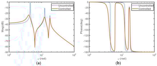 The damping factor of the PIPO controller is set to . Figure 13 shows magnitude and phase plots for this problem, where the peak amplitudes decrease as expected. Therefore, it can be said that the proposed SIMO PIPO controller is effective, even for the MIMO system. Figure 14 shows the uncontrolled and controlled impulse responses. Using logarithmic decrement, the damping factor of the uncontrolled system was calculated as 0.007, and the damping factor of the closed-loop controlled system was calculated as 0.068. Figure 15 shows the uncontrolled and controlled impulse responses, and that the MIMO PIPO controller can suppress vibrations effectively.