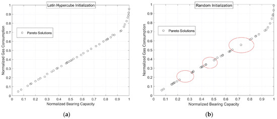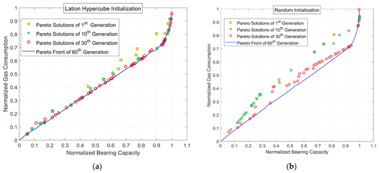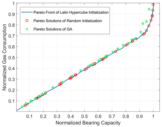 - Firstly, a large iteration period is preset as the stopping condition of the algorithm. Then, the objective function values corresponding to the Pareto solutions obtained by each iteration are stored. These objective function values are arranged from small to large according to the gas consumption (or according to the bearing capacity) to form a 2 × n matrix Ft; n is the number of Pareto solutions, and t is the number of iterations;