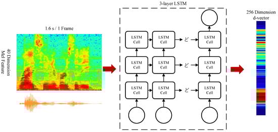 The Speaker encoder extracts the embedding that represents the features of a particular speaker’s voice pattern, which is called the d-vector. The speaker encoder architecture is a three-layer long short-term memory (LSTM) with generalized end-to-End loss (GE2E) []. The input is the Mel-inverted spectrum (MFC) [] with reference audio conversion, having one frame every 1.6 s with each frameshift at 50%, which is equivalent to 0.8 s. The output is a 256-dimensional d-vector. The speaker encoder architecture is shown in Figure 2.