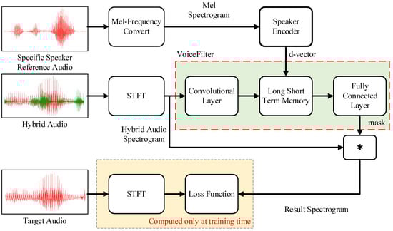 - Wang, Q.; Muckenhirn, H.; Wilson, K.; Sridhar, P.; Wu, Z.; Hershey, J.R.; Saurous, R.A.; Weiss, R.J.; Jia, Y.; Moreno, I.L. VoiceFilter: Targeted Voice Separation by Speaker-Conditioned Spectrogram Masking. In Proceedings of the Interspeech, Graz, Austria, 15–19 September 2019; pp. 2728–2732. [Google Scholar]