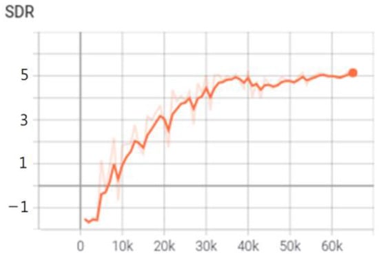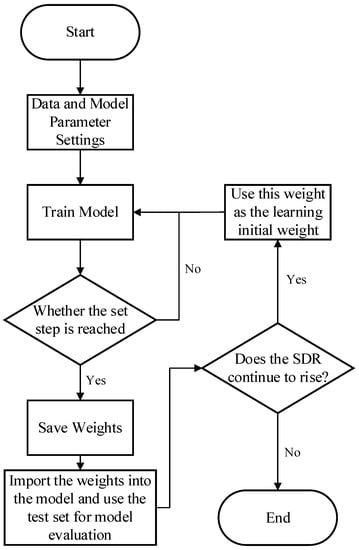 In this paper, we used the SDR for model evaluation and employed the test set for SDR calculation. When the SDR after model evaluation did not continue to rise after several sets of steps, the model was stopped; conversely, when the SDR continued to rise, we retrained the model with that weight as the initial weight for model learning.