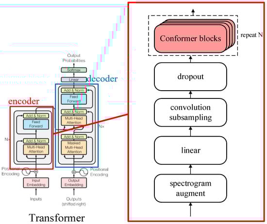The conformer model is a modification of the encoder in the transformer framework, as it incorporates the conformer blocks of the CNN framework. The conformer architecture is shown in Figure 6. The left side is the classic transformer model architecture and the right side (red box) is the internal architecture after the modification. At the start, the spectrum of the audio signal output from the speaker separation system is inputted into the encoder; then, after spectrogram augmentation, it enters linearly in the convolution subsampling, dropout, and the main conformer blocks. Conformer blocks are executed N times according to the input size, just like the encoder in the transformer architecture.