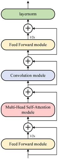 The internal structure of the conformer blocks is shown in Figure 7. It consists of three modules: feed-forward module, multi-head self-attention module, and convolution module, each of which uses a residual connection. The structure of the conformer blocks is like a sandwich, where the feed-forward module is located between the multi-head self-attention module and the convolution module, connecting them with each other; however, each feed-forward module only contributes half of its weight. Finally, it enters the post-layer norm for data processing, that is, the post-norm residual unit is utilized. Figure 8 [] presents the Macaron-net [] structure, which is formed through Equations (5)–(9). Conformer blocks are represented by x_i for the ith input, y_i for the output, FFN denotes the feed-forward module, MHSA denotes the multi-head self-attention module, and the convolution module is symbolized by Convol.