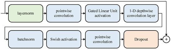 The convolution module starts from the rating mechanism [], which consists of a pointwise convolution layer and a gated linear unit (GLU), followed by a 1D depth-wise convolution layer. The batch-norm is arranged after the convolution layer to facilitate model training, and the pre-norm residual unit is used as in the multi-head self-attention module. The convolutional module architecture is shown in Figure 11.