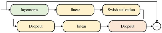 As proposed in reference [], the feed-forward module of the transformer architecture appears after the multi-head self-attention layer. Although it is based on the feed-forward module, it has a nonlinear activation function called Swish activation [] between the two linear transitions. A dropout is also added to normalize the network. The module follows the feed-forward module in the transformer architecture and uses the pre-norm residual unit as shown in Figure 12.