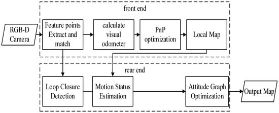 To calculate the visual odometry, the reference frame is obtained from the previous time and the current frame is defined in the now time. The reference frame is selected as the benchmark of the coordinate system, where it is matched with the current frame. The random sample consensus-perspective-n-points (RANSAC-PnP) [] is taken to calculate the coordinate position of the current RGB-D sensor. The previous cycle is then repeatedly performed while the whole movement track of the RGB-D sensor is achieved. This path is considered the track of the mobile robot.