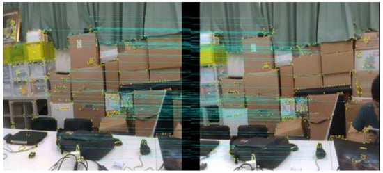 The localization points with the lowest weight and the longest holding time are transferred into long-term memory (LTM) [] with the graph processing time set at an interval time T. Thus, the inverse distance weighting method is used to reorganize the weight to greatly improve the efficiency of the closure loop detection. Figure 17 illustrates the simulation of the feature-matching result.