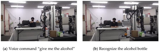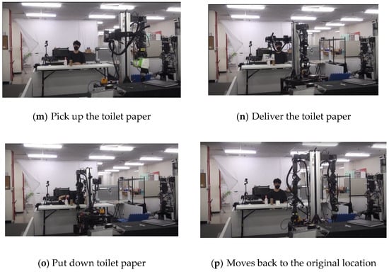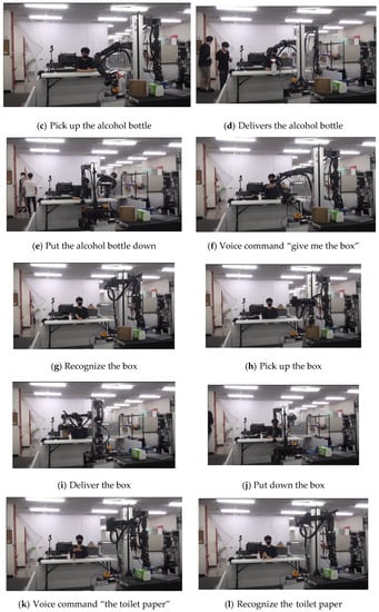 Figure 18 shows the service tasks through a real robot that can correctly pick-up and deliver three types of objects based on the human voice control command. A mobile robot stands in front of the service desk, and is commanded by a human voice to pick up and deliver three types of objects: an alcohol bottle, a box, and a toilet paper. Figure 18a shows the mobile robot receives the control command “give me the alcohol”, and Figure 18b illustrates the mobile robot makes the next action decision by recognizing the control command, which is to pick up the alcohol bottle in Figure 18c. Figure 18d shows the robot delivers the bottle to the service request in Figure 18e. The sequential actions presented in Figure 18f–j exhibit that the service robot successfully picks up and delivers the box to the correct position after recognizing the voice command “give me the box”. Finally, Figure 18k–o show the mobile robot completing the service task as a response to the voice command “give me the toilet paper”. After giving the user toilet paper, Figure 18p shows that the mobile robot moves back to the original location and stands by. The demonstration for the service mobile robot systems in a real environment are fully illustrated in detail in the video presentation, indicating a successful human-interactive robot application in an external noise environment []. In addition to the service actions shown above, the dual-arm mobile robot can perform the other different behavioral actions, such as cup recognition and gripping, according to the specific actions that need to be controlled with human voice after completing the manipulator setting and training for these tasks.