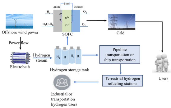 According to existing offshore wind power, according to operation mode, hydrogen production systems can be divided into two types: grid-connected and isolated. This paper studies the grid-connected operation type without considering power conversion parts such as DC/AC and AC/DC; a structure diagram of the offshore wind power and SOFC system is shown in Figure 1.