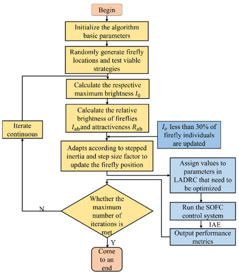 After the analysis of the basic structure of the LADRC, only , , and are known. These three parameters need to be rectified, and the parameters will be sought later by the improved firefly algorithm based on inertia weights to ensure the reliability of the SOFC system.