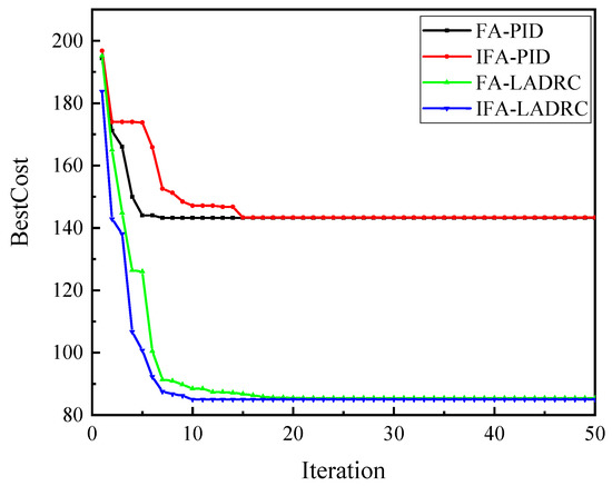 The optimization parameters obtained by four specific control algorithms after 50 iterations are shown in Table 3 and Table 4. After 50 iterations, the system with the control algorithm using IFA-LADRC has a smaller value of the error integral convergence function. Specifically, the system with the IFA-LADRC control algorithm outperforms the FA-LADRC control algorithm and the IFA-PID control algorithm by 0.49% and 68.62%, respectively. This shows that the system with the IFA-LADRC control algorithm has stronger stability and better control effect.