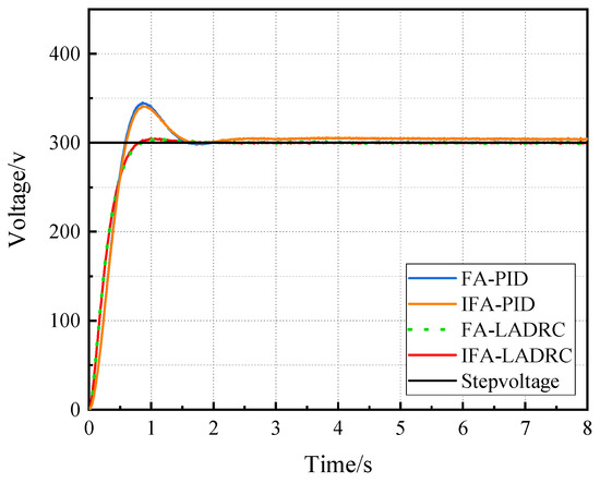 The overshoot of LADRC is significantly smaller than that of the PID controller, as seen in the given voltage step experiment. The optimized FA combined with LADRC can reach the steady-state value the fastest for the system.