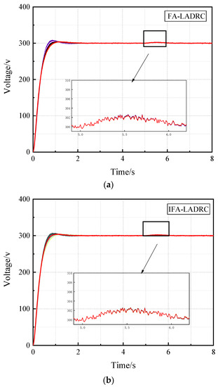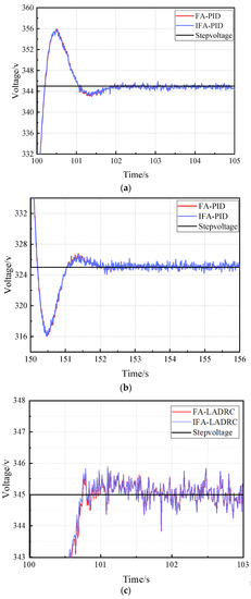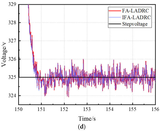 Figure 9a and Figure 9b, respectively, show the comparison of the boost and stepdown effects of the FA and IFA under the control of the PID controller. Similarly, Figure 9c and Figure 9d, respectively, show the comparison of control effects of the FA and IFA under LADRC control.