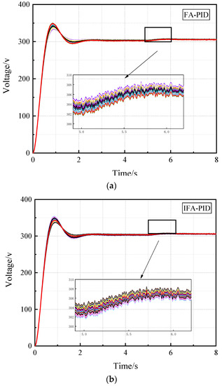Monte Carlo experiment of (a) FA-PID and (b) IFA-PID control methods, wherein the lines in different colors denote system voltage outputs after the addition of a random disturbance within [20%, −20%].