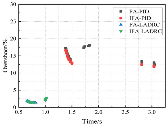 As seen from Figure 12a,b, for the step disturbance carried out simultaneously, the PID controller optimized by the IFA converges faster, and the chattering is relatively small. Compared with the FA-PID scheme, it has stronger robustness. Figure 12 and Figure 13 show that compared with the PID control scheme, the LADRC controller can achieve a better control effect with a faster response, smaller overshoot, and shorter stabilization time. That is, it has a strong anti-interference ability as well as robustness.