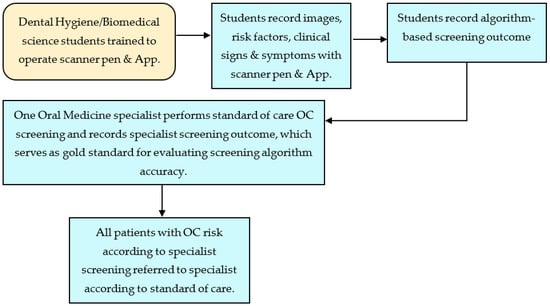 Dental Hygiene students at Concorde College of Dental Hygiene Dental Clinics in Garden Grove, California, and West Coast University Dental Hygiene Clinics in Anaheim, California and Biomedical Science students at the University of California, Irvine, recorded multimodality image sets, clinical signs and symptoms, and risk factor data from each subject using the prototype screening platform. These students were selected to represent community health workers, who are the intended future users of the screening platform. At each study site, the students all received one day of classroom teaching by the same instructor, where they learned about OPML and OC causes, risk factors, and pathology, as well as its clinical manifestations, prognosis, treatment, and outcomes. Next, directly prior to study begin, the students all attended a ½ day of clinical training at their respective school, which was taught by the same instructor at all centers. During this clinic, the students learned to operate the screening platform’s prototype scanner pen and App. Throughout the study duration, the students recorded study participants multimodality images, risk factors, clinical signs and symptoms with the scanner pen and App and they then documented the ensuing algorithm-based screening outcome as either “no increased OC risk” or “increased OC risk”. Imaging sites were selected in each subject as follows: in all subjects with lesions, all soft tissue areas manifesting any kind of visual changes were imaged. Then, where available, contralateral lesion-free tissues were also imaged in the same subject. In healthy subjects, 12 intraoral sites were imaged, including buccal and vestibular mucosa, dorsal, ventral, and lateral surfaces of tongue, floor of mouth, palate, soft palate, and tonsillar regions. Finally, one oral medicine specialist performed a full standard of care OC screening and she subsequently recorded a screening outcome as either “no increased risk” or “increased risk” for each study participant (Figure 1). During this project the same oral medicine specialist performed all screening in all participants at all three clinical sites according to the standard of care, combining clinical examination with risk factors and patient history. The specialist screening outcome served as the gold standard for evaluating screening platform accuracy. Finally, all study participants with increased OC risk according to the specialist screening were informed of the screening outcome. They were then referred to a specialist for diagnosis and entry into the pathway of care.