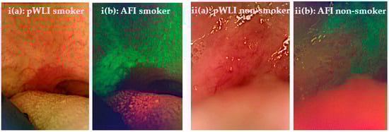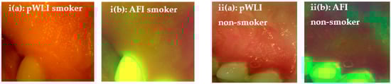A total of 1099 pairs (pWLI and AFI) of intraoral images were collected from the 318 study subjects (Figure 4 and Figure 5). Figure 4 shows image pairs of typical erythematous lesions in the anterior tonsillar pillar region obtained from a smoker and a non-smoker. In the pWLI, the smoker’s tissues appear hyperkeratinised, thickened, and fibrous (Figure 4i(a)), which is typical of smoking-related changes in the oral soft tissues. These changes are also clearly visible in the AFI of the smoker (Figure 4i(b)). Because thickening and whitening of the soft tissues can also be an indicator of OPML or OC, there is the potential for a confluence of smoking-related and neoplasia-related mucosal changes in these individuals, as shown in these images. In contrast, the same type of lesion in the non-smoker appears more moist and considerably less fibrosed, less white, and less thick in the pWLI and the AF images (Figure 4ii(a) and Figure 4ii(b)). Figure 5 shows image pairs of papillary hyperplasia from a smoker ((Figure 5i), and a non-smoker ((Figure 5ii)). The thick, red, dry looking fibrosed surface layer in the smoker’s gingival tissues extends across the entire visible gingival surface, with a quite uniform white color, coupled with increased bulk across the entire spread of the tissues, from the gingival margin extending up to the mucosa (Figure 5i(a)). In the non-smoker, there is an evident localization of change in color and texture, as well as swelling, which appears inflammatory rather than fibrosed in nature (Figure 5ii(a)). The smoker’s tissues evidence considerably more backscattering in the AFI (Figure 5i(b)) vs. the non-smoker (Figure 5ii(b)).