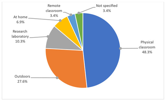 Figure 2 shows that most learning activities (78.57%) were performed indoors [21,22,23,24,25,28,29,30,31,32,34], whereas 42.86% were performed outdoors [22,26,28,29,30,33] (implying some kind of field study, i.e., learning activities in real/natural settings). Some activities (28.57%) combined indoor and outdoor spaces [22,28,29,30]. One learning activity was carried out in a hybrid mode [31].