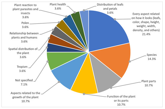 As can be seen in Figure 3, students observed different features of the plants during their learning activities. Appearance of plants was the key feature considered when performing learning activities (71.43%) [22,23,24,25,27,28,29,30,31,34]. Biological needs was the second most important aspect considered (42.86%) [24,25,29,32]. Lastly, the functions of the plants were the least considered aspect [21,22,32]. The rest of the papers do not specify which parts of the plant the students took into account in the learning activities [26,33].