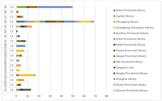 The total number of appearances of these two video topic categories, “Reading Promotion (S6)” and “Book Recommendation (S9),” far exceeds the number of other categories of content combined, which confirms the conclusion that Douyin is a tool for public libraries to provide online services and resources to the public. Additionally, this aligns with recent findings that patrons receive Instagram promotions well [31,32]. Notably, during the lockdown of the COVID-19 pandemic [32], more patrons tended to use mobile Internet to access library services. Douyin and other short-form videos are low-cost and unrestricted by space and time, facilitating the public to access library services because these promotions can provide related content and links [55].