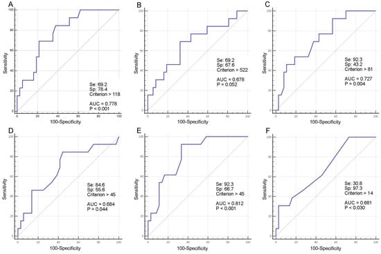 Related to falls, the maximum speed of oscillation at OE in the stabilometric test is considered as a predictive threshold value of fall event (Figure 1, panel A, p < 0.001; criterion > 118). The path length at OE (Figure 1, panel B) could also identify the predictive threshold value of fall event (p = 0.052; criterion > 522). The sway area at OE is a predictor of fall event with criterion > 81 (p = 0.004) (Figure 1, panel C). The anterior-posterior (AP) ground reaction force (GRF) is a predictor of fall event for both limbs, with a criterion > 45 (pright = 0.044, pleft < 0.001, Figure 1, panels D–E). The duration of the TUG (Figure 1, panel F) can predict the fall event with a criterion > 14 (p = 0.030).