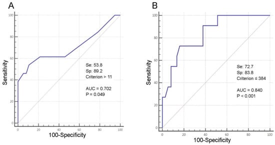 The duration of the TUG (criterion > 11, p = 0.049) and 6 MWT distance (criterion ≤ 384; p < 0.001) are together parameters that could identify the predictive threshold value of the condition of frailty (Figure 2, panels A and B).