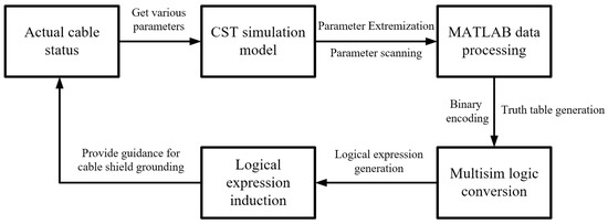 Figure 1 shows the overall process of the shield grounding optimization method. The first step was to obtain relevant parameters, such as the number, lengths, and position relationships of cables according to the actual state of the cables, to establish the CST (Computer Simulation Technology simulation software) simulation model. The simulation results for all the shield grounding states were obtained by means of parameter extremization and parameter scanning simulation. The second step was to use MATLAB to encode the simulation results in binary form and generate the truth table. In the third step, the logic conversion module of Multisim was used to extract and simplify the logical expression of the truth table. The output logical expression indicated the corresponding relationship between the grounding state of the shield and the shielding effect. The fourth step was to analyze and summarize the logical expression used to guide the termination of the cable shield. The following is a detailed explanation of each step in the method.