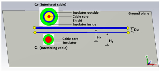 As shown in Figure 2, the number of cables was set as , denoting them as . The cable lengths are . The vertical heights of the cable from the reference plane are , respectively. represents the horizontal distance between and , etc. Each cable was wrapped in shielding. The two ends of the shield were grounded through the resistance. The side near the signal-sending end is called the near end, and the subscript is . The grounding resistance of the near end is . The side near the receiving end of the signal is called the far end, and the subscript is . The grounding resistance of the far end is . Actual cables may be bent and stacked, which greatly increases the difficulty of modeling. In addition, the positions and states of cables may not be identical each time during actual tests. Therefore, modeling a cable in strict accordance with a cable shape is not universal and is not important. In addition, the bending and stacking of cables may affect the signals inside the cables, which may impact subsequent test results and lead to a misjudgment of the shielding effect. Therefore, this study only considered the simplest parallel cables and eliminated the influence of the bending and stacking of cables to analyze the shielding effect of the shield under different grounding states.
