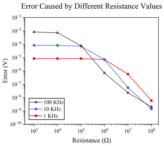 Figure 4 shows that, the larger the resistance value of , the smaller the error between the simulation results for parameter extremization processing and the simulation results for an ungrounded shield. When is taken to be Ω, the error drops by an order of magnitude of , which allows the state of an ungrounded shield to be completely simulated. In addition, it can be seen from the graph that, the lower the frequency of the interference source, the slower the decrease in the error curve of parameter extremization. This means that, at low frequencies, greater resistance and a deeper degree of parameter extremization are required to simulate the state of an ungrounded shield. The reason is that the low-frequency signal interferes less with the line that is subjected to interference compared to the high-frequency signal; after the double-ended well-grounded shield (a smaller grounding resistance means better grounding) was introduced, the signal improvement amplitude was also small, and when the signal frequency increased, the well-grounded shield caused a drastic improvement, so the curve decreased faster.