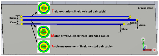 In accordance with the method described in Section 2 to establish the CST simulation model of the scanning mirror drive control system cable (Figure 7), and to obtain the logical expression as shown in Equation (2), where the first subscript of is the initials of the cable name, the second subscript indicates the near end () or far end () of the shield. means grounded; means ungrounded. The logical expression was analyzed as follows: