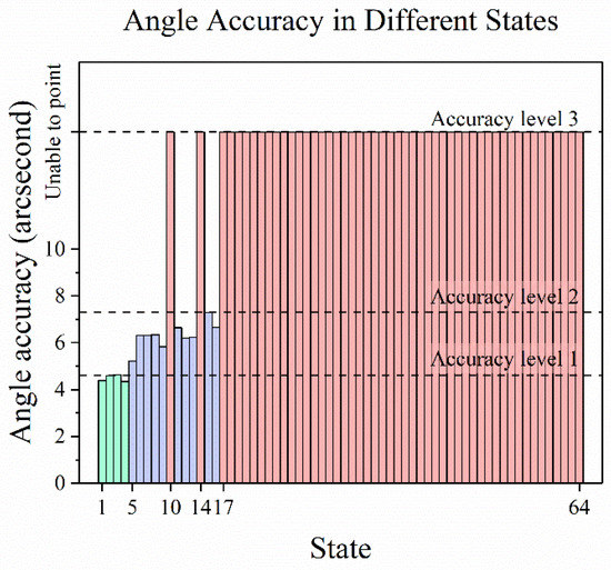 The measured results are shown in Figure 8; the state number order 1–64 corresponds to , where “0” means no grounding and “1” means grounding. According to the test results, the angle accuracy of the scanner can also be divided into three levels, which were analyzed as follows: