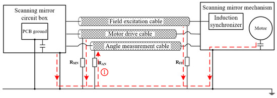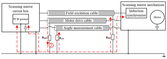 Path 1 in Figure 9 shows the flow of interference signals when the near end of the angle measurement cable shield is grounded. Each device is connected to the same reference ground, and since the actual grounding is not fully ideal, the interference is not immediately released through the ground, and various parts of the system are coupled to each other. When one end of the angle measurement cable shield is grounded, it is subject to interference from the motor side, the circuit box side, other cables, and many other sources. The interference flows into the angle measurement cable shield and affects the inner core of the cable, resulting in too much interference in the inner core and making the scanner unable to complete the pointing command, as shown in accuracy level 3 in Figure 8. Additional experimental testing also proved the following explanation: For the near end of the angle measurement cable shield ground, needs to be increased to 1 kΩ from 0 Ω, and the scanner can then complete the fixed-point pointing command. At this point, if the near end of the motor drive cable shield is grounded, then needs to be increased to 2 kΩ, and the scanning mirror can then complete the fixed-point pointing command. At this point, if the field excitation cable shield is grounded near the end, needs to be increased to 3 kΩ for the scanning mirror to complete the pointing command. As more equipment grounding leads to greater interference in the shield of the angle measurement cable, the increase in can reduce the interference signal on the shield, which in turn reduces the interference in the core of the angle measurement cable. When increases to infinity, which is equivalent to no grounding, the angle accuracy becomes smaller, as shown in accuracy level 1.