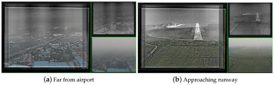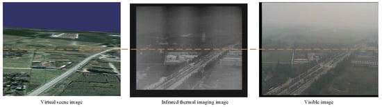 Low visibility is the main reason for flight accidents during approach and landing, so virtual reality has come into being. In order to solve this problem, the current global technical means mainly include heads-up guidance systems, enhanced visual systems (EVSs), and synthetic visual systems (SVSs) [,]. Among these, EVSs and SVSs are designed to provide pilots with enhanced views of the ground and air conditions by using advanced infrared thermal imaging and visible-light sensors, as well as cockpit displays. As the two most important photoelectric sensors, infrared thermal imaging and visible-light imaging sensors have different imaging mechanisms and application scenarios, and the information that they obtain is naturally complementary. Infrared thermal imaging obtains a target’s temperature radiation intensity information, while visible-light imaging reflects the target’s texture and contour information. By integrating infrared information and visible-light information into one image, we can achieve feature information complementation and reduce redundant information [,,,], which has an important value and significance in the field of low-visibility monitoring.