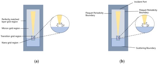To construct the model, we need to extract the longitudinal profile of the probe axis, as G. Conrad’s study has shown that the decrease in dimensions resulted in less information loss [17]. To cut down the calculation consumption, the x-direction range should not be excessively broad, and the y-direction range should completely cover the length of the modified probe so as to provide adequate space for tip. This reduces the amount of space for detailed calculations. The near-field scattering simulation model is seen in Figure 1b.