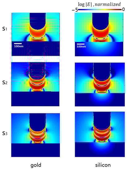 The near-field electric field distribution image for gold and silicon at harmonic order signal (S1, S2, S3).