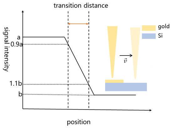 In the definition of s-SNOM system resolution, the theoretical resolution of the system is the transition distance between the maximum signal and the minimum signal of the scattering signal between silicon and gold in the silicon–gold grating, which ranges from 10% intensity to 90% intensity, as shown in Figure 6.