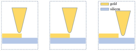Our model can simulate the effect of electric field augmentation at any location within the radius of curvature of the tip. This feature enables us to describe the effect of the metal steps on the near-field scattering signals of each order. As shown in Figure 7, the following is a schematic representation of three typical states corresponding to the tip and edge in the scanning process. By simulating the change of electric field intensity of each order’s signal under these three conditions, we can further understand the influence of the step effect in the imaging process, so as to find ways to reduce the influence of the edge effect on s-SNOM imaging. The thickness of the gold strip is set to 100 nm. The frequency of the incident wave is 4.2 THz, and the other simulation settings were described in Section 2.2. The scattering signals of each order in three positions are shown in Figure 8.