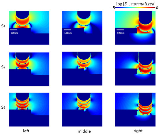 Through the data processing of the simulation, the signal of each order is extracted, and the near-field electric field intensity image near the tip is reconstructed. Figure 4 depicts the near-field electric field distribution image for the two materials at the extracted harmonic order signal (S1, S2, and S3), which corresponds to the vertical section electric field division diagram produced by others in the 3D simulation [16]. The incident electric field is confined to a tiny region close to the tip, and a “hotspot” is created by the effect. Figure 5 depicts the width of the field distribution with the gold sample. For the increasing order n = 1−3, the lateral full width (2 nm above the sample) at half-maximum (fwhm) 2Γ of the field profiles decreases continuously and the value could be smaller than the tip radius (100 nm). All the results of our 2D model are in good agreement with those of others’ 3D models [16,18], which proves that our 2D model can reduce the amount of calculation and ensure its correctness. The results depicted in Figure 3 indicate that the electric field enhancement can penetrate non-metallic materials such as silicon, and that the scattering electric field of gold is stronger than that of such materials, so it can be used to detect metal structures covered by layers of penetrable materials. This is also an application direction for s-SNOM technology, and significant development has been carried out in this field [24]. It can image the nm antenna covered by layers of penetrable materials and detect whether the antenna is damaged without damaging the surface. Thus, with the development of nm technology, there will be more scenarios that need to use this technology to solve more nm imaging problems.