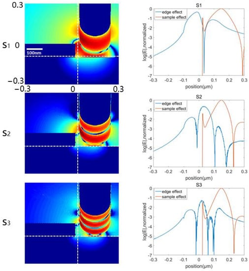 As shown in Figure 8, there is an electric field enhancement with the tip’s side when the tip transitioned from the middle to right. From top to bottom, the retrieved signals (S1, S2, and S3) are shown in ascending order. The absolute strength of the electric field enhancement between the gold strip and the gold tip is stronger than the electric field enhancement effect of the silicon sample and the gold tip. Even when the needle tip leaves the upper space of the gold sample and is above the silicon sample, the electric field intensity is still strong where the needle tip is close to the gold. For the received signal, an overall signal strength is obtained, which will lead to the conclusion that the needle tip is still in the gold sample during imaging. Due to this reason, the electric field enhancement effect of the interaction between the tip and the sample silicon is hidden. This phenomenon is most pronounced in S1. AS the signal order n increases, the edge effect is steadily reducing. In practical application, with the increase of the order of the demodulated signal, the theoretical resolution that can be achieved in imaging will be further improved as the edge effect of gold is further suppressed. To further comprehend the lowering of the step impact, we extract and process additional image data. The electric field strength values are extracted along the white dashed line, and we extract the electric field strength value and obtain the findings depicted in Figure 9.