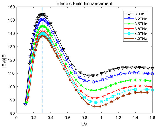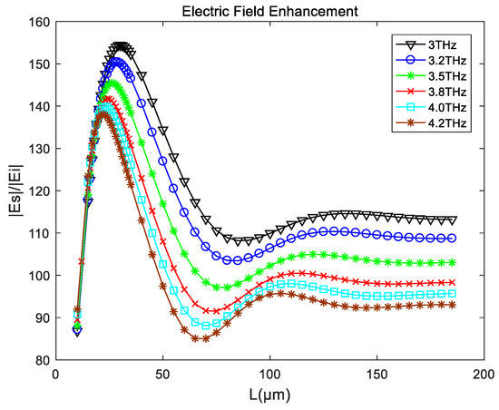 Shown in Figure 10 is the result of the influence of varying the tip length in the electric field at different frequencies. The electric field enhancement effect shows a positive correlation with the increase of tip length at the beginning, and when it reached a peak, its enhancement effect began to decline. Therefore, in practical applications, we expect to find the tip length corresponding to the point with the strongest electric field enhancement effect as the actual scattering probe to obtain a better imaging effect. With the condition that the tip radius does not change, there is a clear correlation between the maximum electric field intensity corresponding to the tip length and the incident wave frequency. The influence of the electric field enhancement is illustrated by matching the length of the tip to the incident wavelength, as shown in Figure 11.