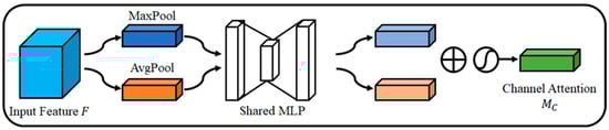 Figure 4 is the channel attention module of CBAM. Channel attention creates an attention map by utilizing the relationship between channels of features. Channel attention compresses the space through MaxPool and AvgPool to efficiently perform calculations. The channel feature association between each feature map is calculated through a multi-layer perceptron (MLP) of the compressed features. Afterwards, an attention map is created with the sum of the two outputs and the sigmoid between 0 and 1.