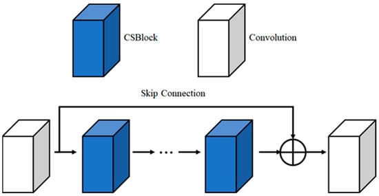 Equation (11) is the formula of the final CSBlock to which channel attention and spatial attention are applied. SA(*) is the spatial attention process of Equation (10), and CA(*) is the channel attention process of Equation (9). Stable learning was conducted using the residual scale. This structure effectively solves the problem of inability to learn or performance degradation that occurs in the process of learning a deep network by limiting the value of the gradient.