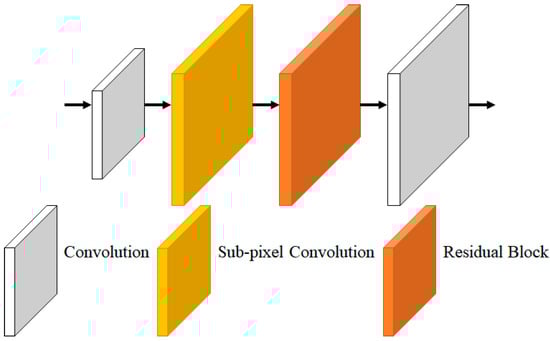 Equation (16) is an equation for extending the feature map, is an extended feature map, UP is a sub-pixel convolution, is a three-depth feature, is a 10-depth feature, is input LR image, and H is a convolution. The traditional upsampling method using deconvolution can suffer from the checkerboard artifact problem, which has been addressed by using small strides and large kernel sizes. However, this approach requires a significant number of parameters and computations, which can cause performance degradation. The proposed network expands feature maps using sub-pixel convolution, which avoids the need for a large number of parameters and computations. Sub-pixel convolution was used differently depending on the scale factor to minimize the loss generated in the parameter and expansion process and reduce the amount of computation. Two and three times were extended using one sub-pixel convolution, and in the case of four times, they were extended using two times the sub-pixel convolution.
