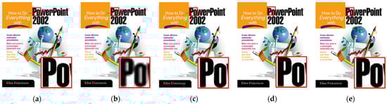 Visual evaluation for a scale factor of 4× on the image “PPT3” from Set14: (a) Ground Truth (PSNR, SSIM); (b) Bicubic (24.31, 0.7889); (c) VDSR (29.93, 0.9344); (d) EDSR (31.51, 0.9594); (e) Proposed (31.53, 0.9593).