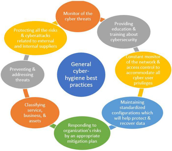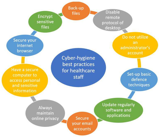 Jointly with other best practices, the deficiency of essential techniques, such as the above, may lead to poor cyber hygiene. Additional recommended set of best practices for small business enterprises targeting cyber risks have been introduced [53]. Meanwhile, cyber hygiene best practices, which can be used by healthcare staff to maintain privacy and security, are illustrated in Figure 2 [56,57].
