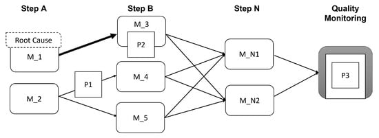 Figure 1 and Table 1 depict an example of overlap: the problem’s origin is located in Step A—Machine M_1; however, all products that go through the root cause tuple also go through Step B—Machine M_3. In such a scenario, it is not possible to distinguish which of the tuples was the origin of the problem. Overlap is particularly problematic when trying to use classifiers to automatically extract root causes, as previous solutions in the literature have proposed. This arises due to the knowledge structures (e.g., decision trees, rules) being generated through the selection of the most representative factors, regularly discarding factors highly correlated with the representative ones, due to their supposed redundancy. The criterion used to identify redundant factors can lead to hiding factors that are the true root cause, giving more relevance to the representative factors. For example, when generating a Decision Tree (DT), using the information-gain criterion for splitting promotes the use of factors with more levels, although the root cause may be a factor with a smaller number of levels. In the example above, a DT based on information gain would select Step B–Machine M_3 as a root cause, discarding the true root cause (Step A–Machine M_1) and providing a wrong diagnosis.