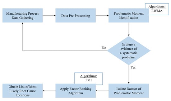 Analyzing location-type data is still relevant, despite being just the first level of data. To detect the physical aspects of ARCA, factories require proper infrastructure, which some factories do not have. However, data on how the product flows through the manufacturing process are usually readily available, which enables the determination of the root causes’ locations. In situations where the manufacturing process is particularly complicated (e.g., in semiconductor manufacturing []), even production flow data can become difficult to analyze, which justifies the use of Data Mining (DM) and Machine Learning (ML) techniques in the development of solutions that aid in diagnosis.